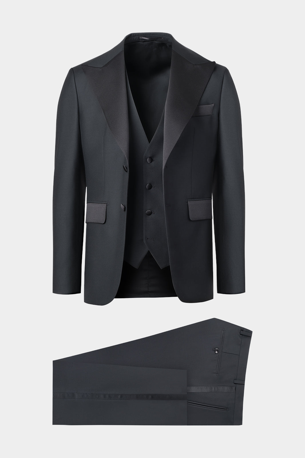 Our three-piece, tailored tuxedo embodies elegance in all its splendor. Crafted from 100% virgin wool by Vital Barberis Canonico, it offers impeccable drape and superior comfort. The tailored waistcoat completes the ensemble with distinction.